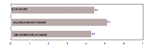 This section of the report summarizes the results of the quality surveys. Section Two will profile your highest and lowest scores in quality management, representing current quality strengths and weaknesses in the organization. Section Three of this report outlines our recommendations for actions to attack weak areas in quality management. Section Four describes the demographics of the employees who participated in this quality survey. Sections Five through Eleven contain the detailed comparisons of each element of your quality measurement scores to both similar organizations and Malcolm Baldrige National Quality Award winner scores. Section Twelve contains your estimated score on the Baldrige Examination. (Winners score in the 900 point range.)